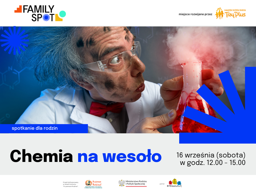 16 września zapraszamy na "Chemię na wesoło". Zaczynamy z panią Asią o 12.00, ale w ten dzień w BCOPiW obchodzony będzie Dzień Rodziny, który jako ZDR 3+ i FamilySpot będziemy współorganizować. W tym dniu od 10.00 będzie się działo! Na nasze warsztaty wstęp jest oczywiście bezpłatny, ale ze względów organizacyjnych obowiązują zapisy pod nr tel. 600 264 414.